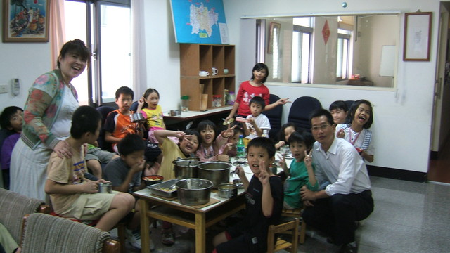 傳愛課輔班享受愛心午餐,乃玉老師及丁牧師一同與孩子一啟開心入相喔!我咧...嗯...(在拍照嘛)
