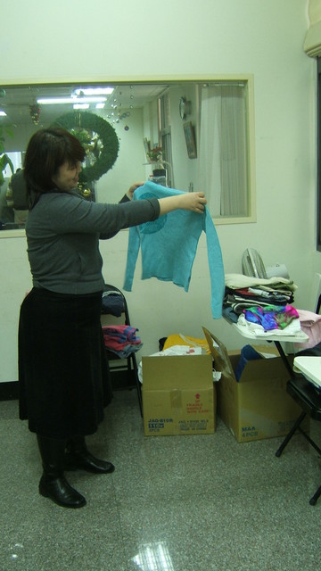 乃玉老師正在整理各方愛心捐助的衣服,要把適合的、不錯的挑起來給小朋友喔!乃玉老師課輔班的大天使,不禁要說:有妳在真好。