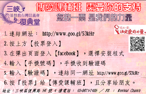 傳愛課輔班成立四年多以來,一直都是靠著對外募款及弟兄姊妹的奉獻支持整個事工,去年我們從別的慈善機構得知台新銀行每年都會舉辦「您的一票,決定愛的力量」票選活動,今年我們也報名參加了社會福利50萬元組的徵選活動。