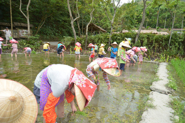 「插秧」是早上的重頭戲,別說是孩子了,我們的老師也有很多人沒有這樣的經驗。插秧必須彎著腰、低著頭......汗水從臉頰上低落,以前總是在書上看到「誰知盤中飧,粒粒皆辛苦」,現在可以好好地「體驗」一番了......