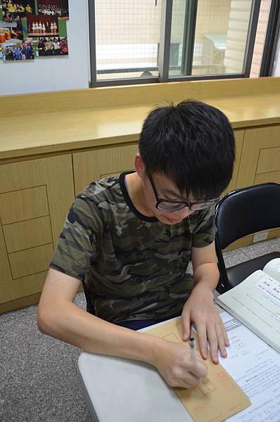 他是傳愛課輔班的學生~家佑,正在填寫他的大學入學回函,日前他通過了學測與面試,成為傳愛課輔班第一個大學生。