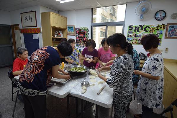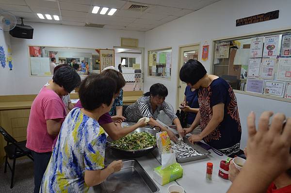 在教會的交誼廳進行的是「銀髮族健康俱樂部」的活動,今天的活動主題是「韭菜盒子」,看到豐富的餡料,坐在辦公室的我們,已經開始期待成品出爐後可以一嚐美味......