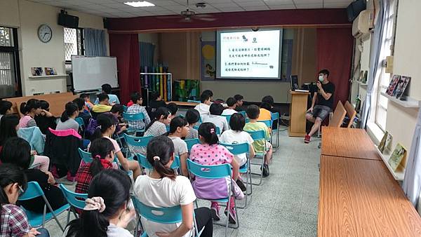 本堂大學生向五年級學童分享,拉近與學童的距離。